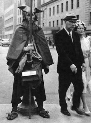 Moondog murió en 1999 a los 83 años, pero sus discos todavía se escuchan. Parecería incluso que está empezando a ponerse nuevamente de moda (hace unos meses se publicó la primera biografía sobre él, en inglés, hecha por un tal Robert Scotto). A mí lo que más me gusta de Moondog, aparte de su música estupenda, es la increíble fuerza que poseía. Fue un ciego que hizo olvidar a todos su ceguera, un alienígena capaz de sobrevivir en la dura vida de la diferencia radical. Invidente y raro como era, debía de poseer un encanto singular, porque se casó dos veces (tuvo una hija) y mantuvo varias relaciones sentimentales importantes. He visto la foto de una de sus novias: asiática, elegante, bellísima. Es como el cuento del patito feo pero hecho realidad: un indigente, en apariencia un pobre tipo marginal, chiflado y fracasado, que en realidad es todo un personaje, un artista admirado, un músico famoso. La próxima vez que vean a un mendigo estrafalario por la calle, repriman su condescendencia y acuérdense de Moondog.